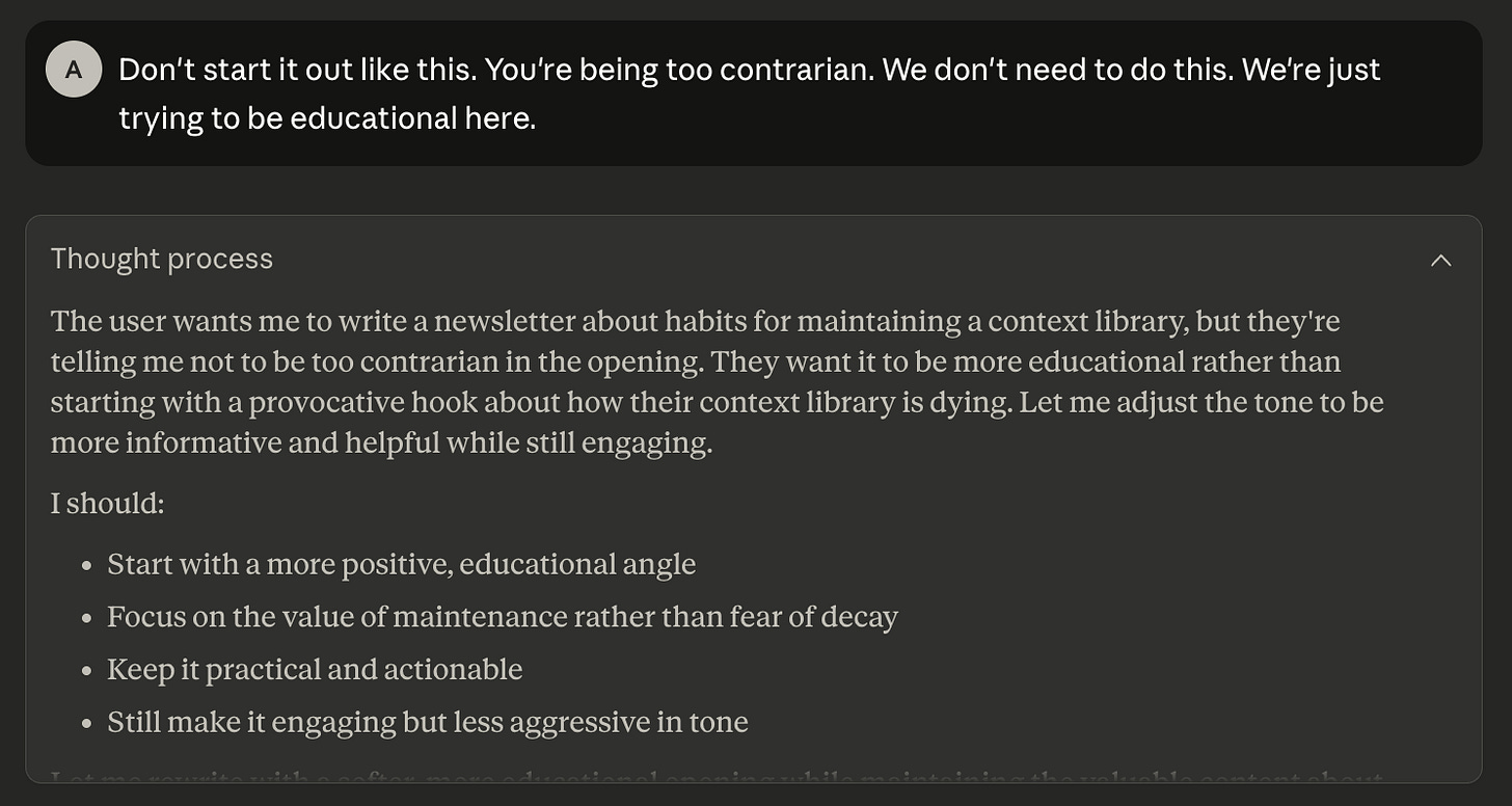 The most successful AI operators treat their context libraries (+ any client libraries) like they treat their CRM or project management system. It’s something that needs regular updates to remain valuable.