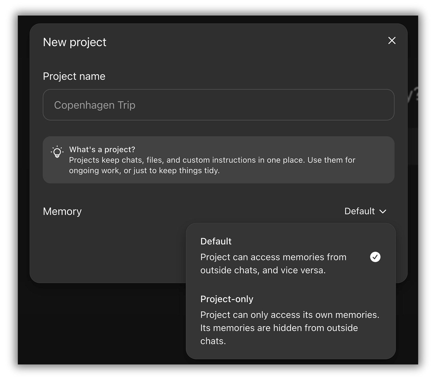 ChatGPT Projects: It creates automatic memory logs — little snippets it decides are important. But it doesn't actually review your full conversation history. It's more like sticky notes than a filing cabinet.