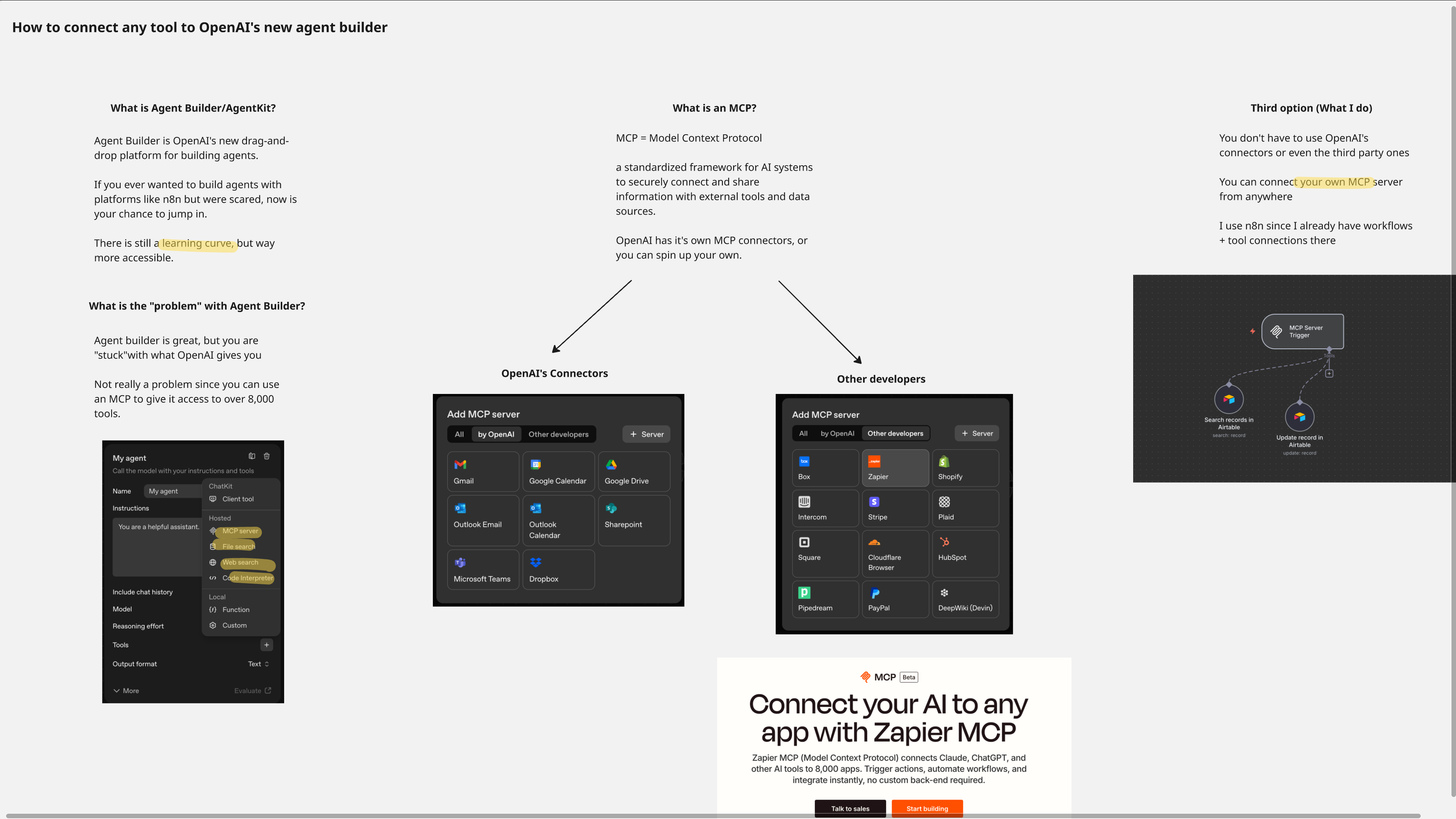 Learn how to break the “lock‑in” myth and supercharge OpenAI’s Agent Builder with real-world tools. This workshop demystifies the Model Context Protocol (MCP) and shows three practical ways to extend your agents: use OpenAI’s native connectors, plug in Zapier for 8,000+ apps, or run your own custom MCP server with n8n.