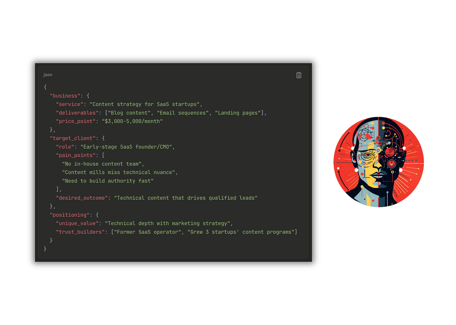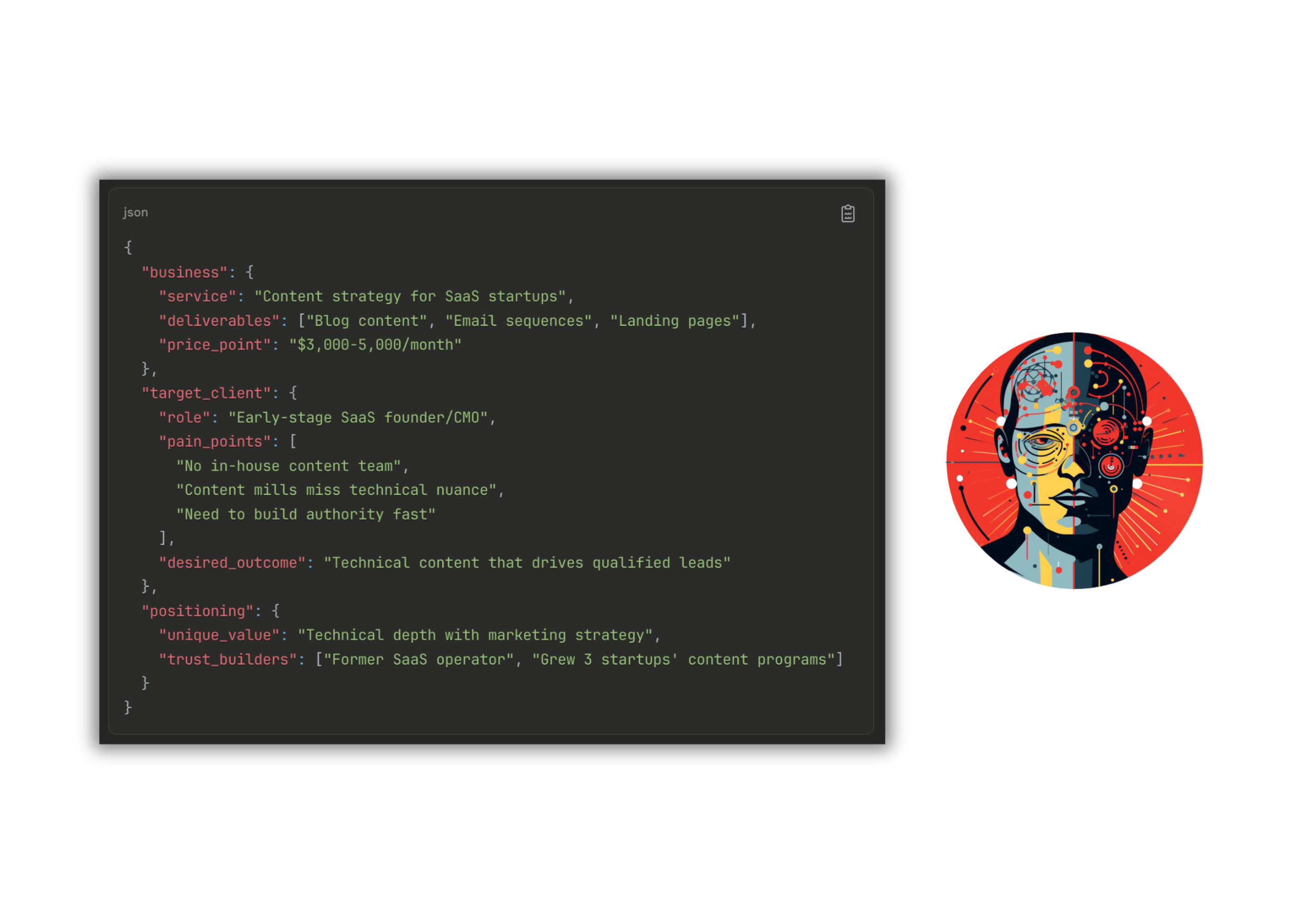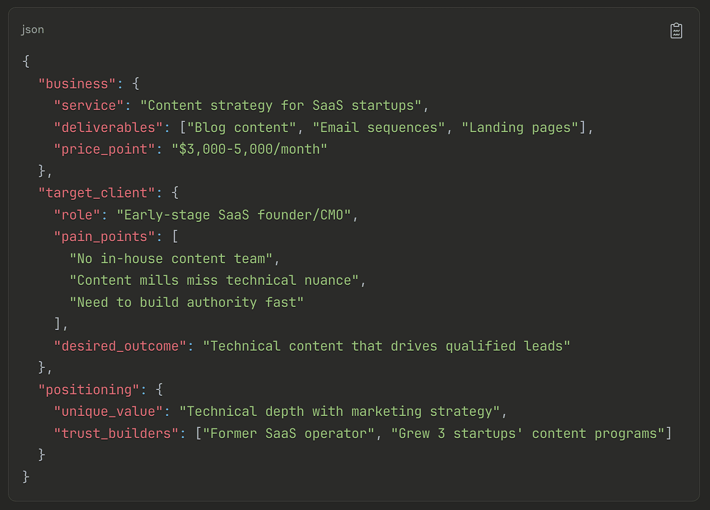 I'm a marketing consultant who helps SaaS startups with content strategy. I create blog content, email sequences, and landing pages. My clients are usually early-stage startups who need to build authority but don't have an in-house team. They've tried content mills or random freelancers but it never captures their technical expertise properly. I charge $3-5K per month for a content package.