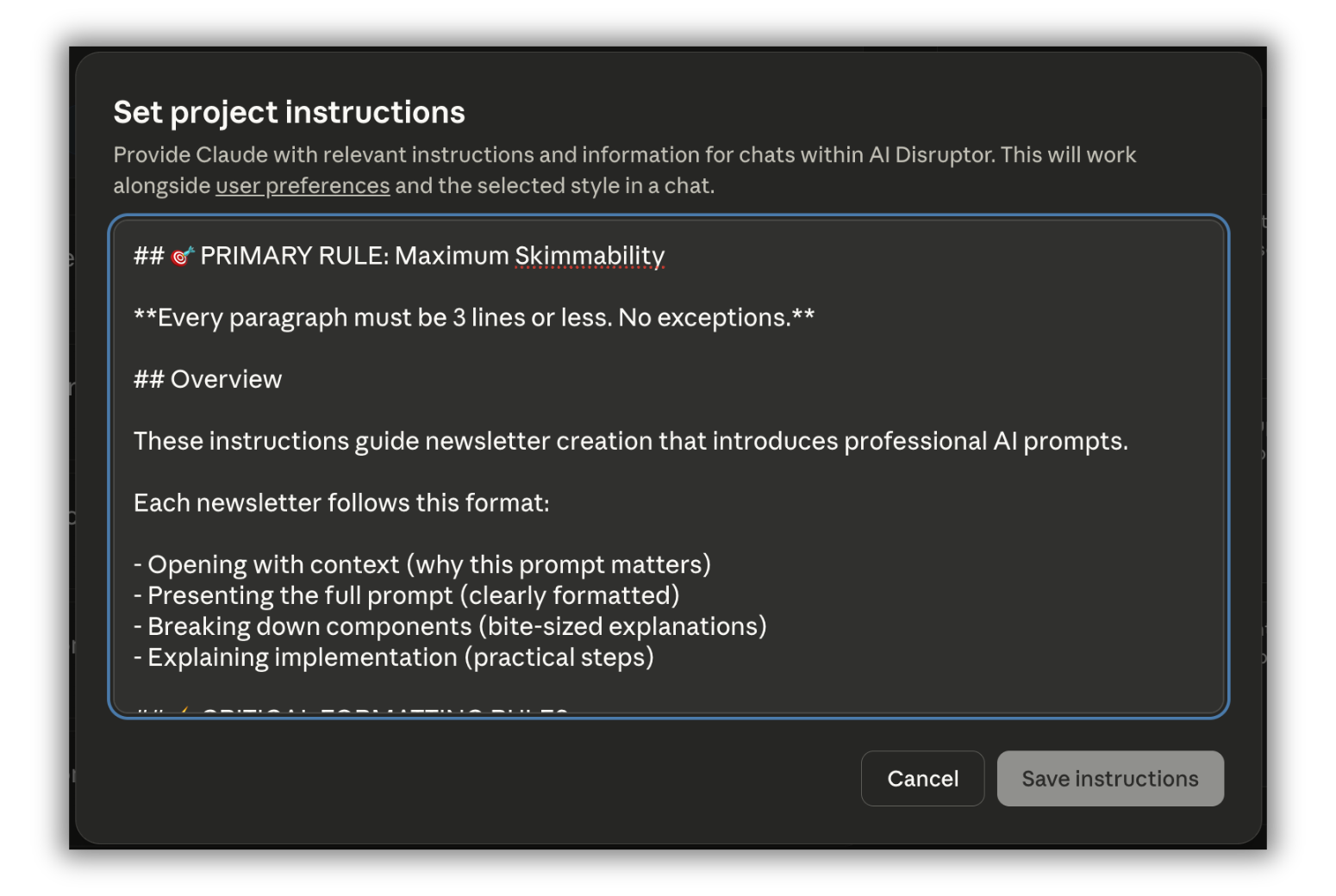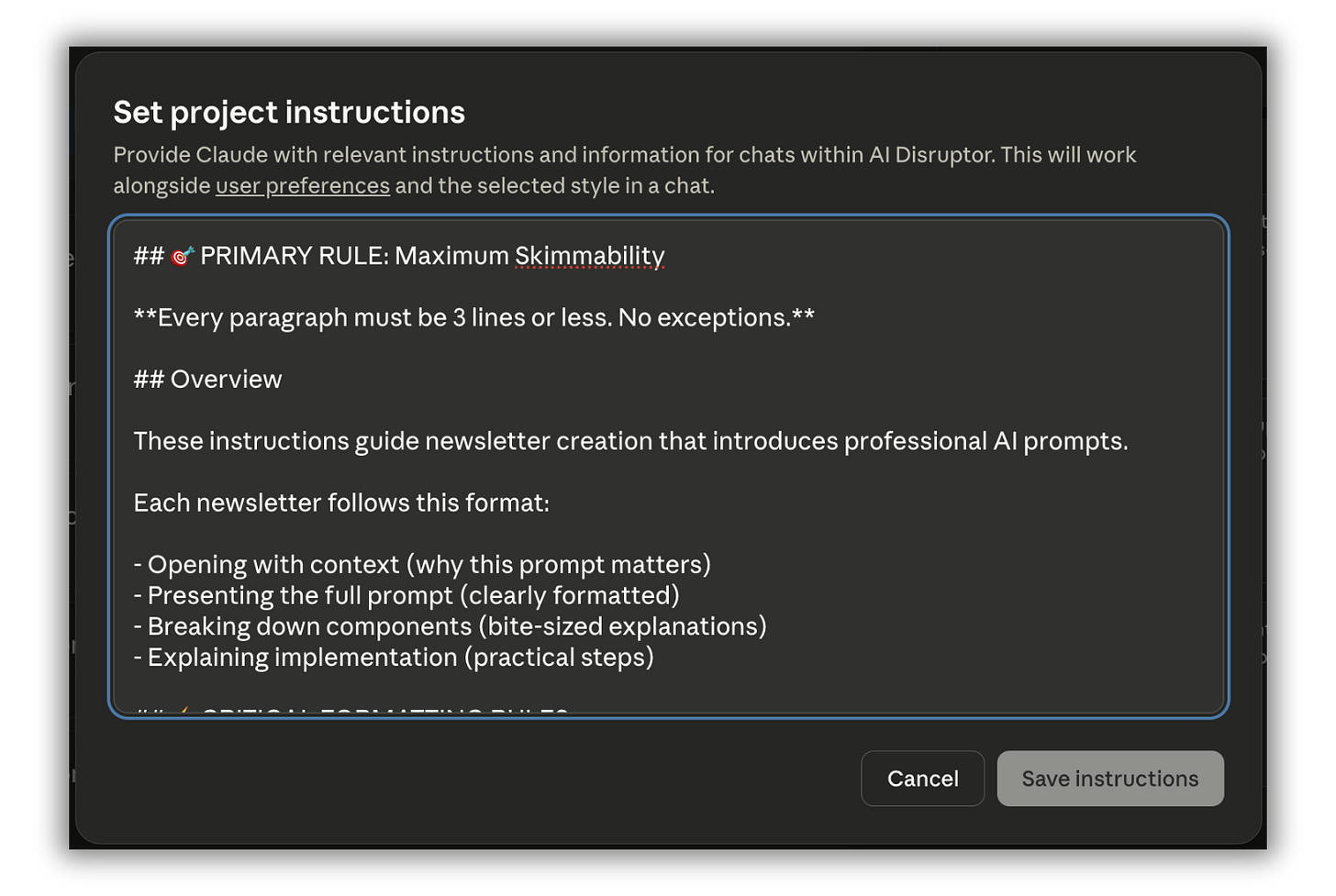 Project Instructions = The permanent blueprint for how AI structures your content. Think formatting rules, section order, and output requirements that live in your AI project forever. Write once, use infinitely. You can also think of it as the system prompt vs the user message.