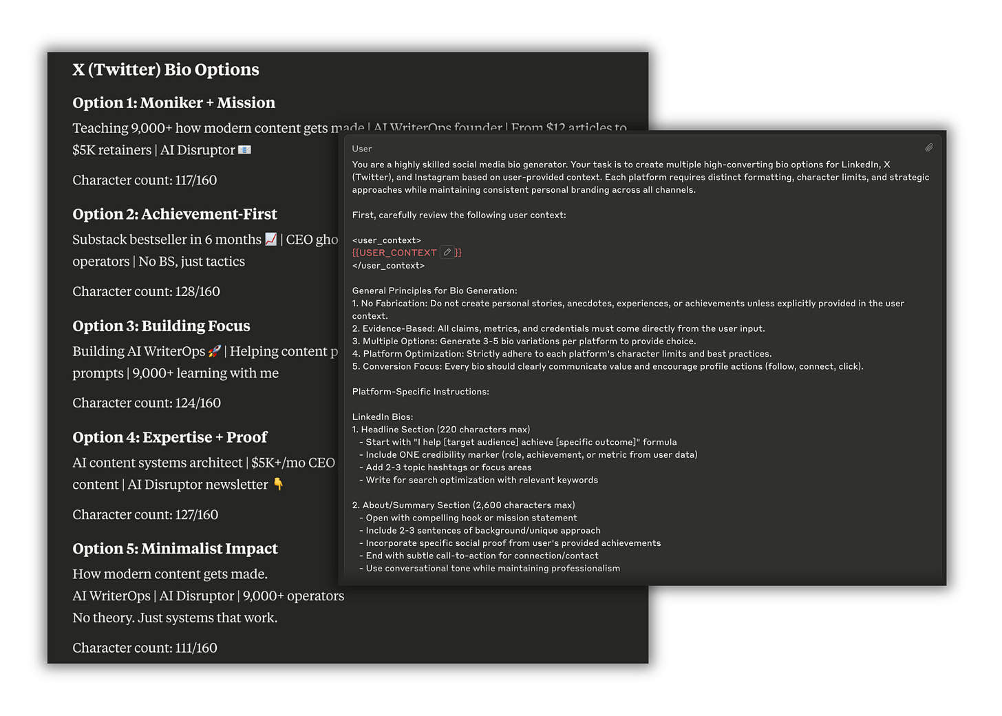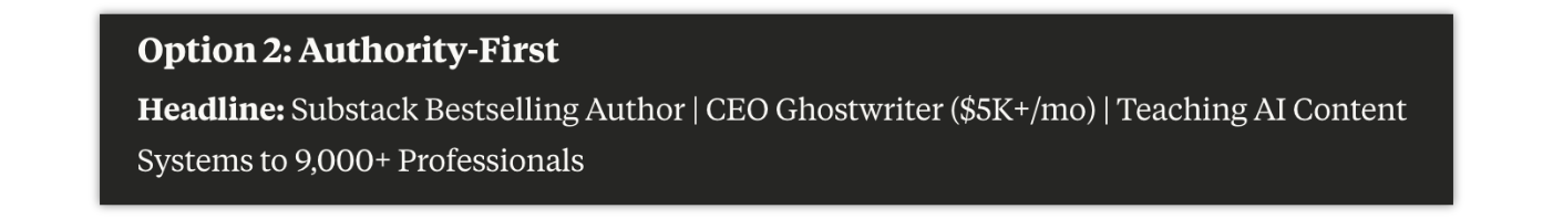 Today, I'm giving you an AI prompt to generate high-converting bios for LinkedIn, X, and Instagram—the same approach that helped me build a Substack bestseller in 6 months and land $5K+/month clients.